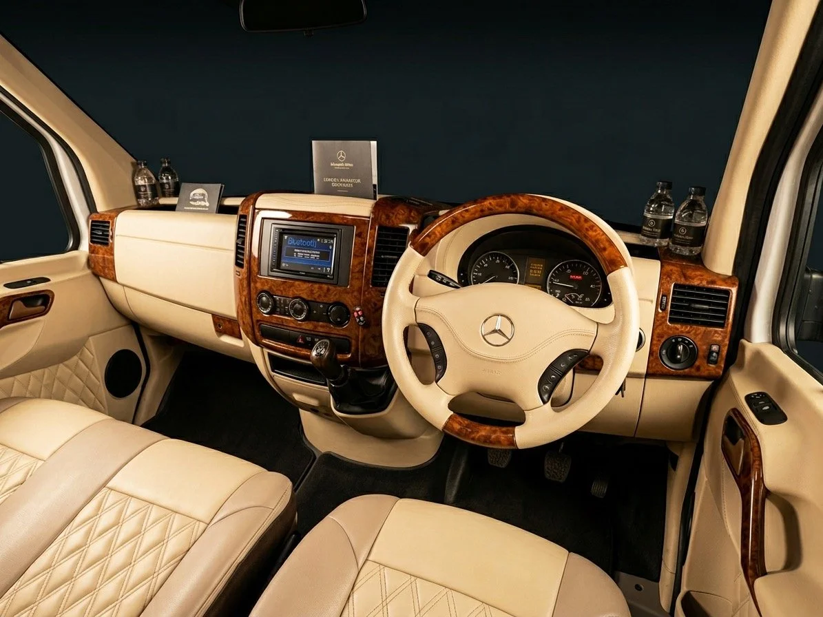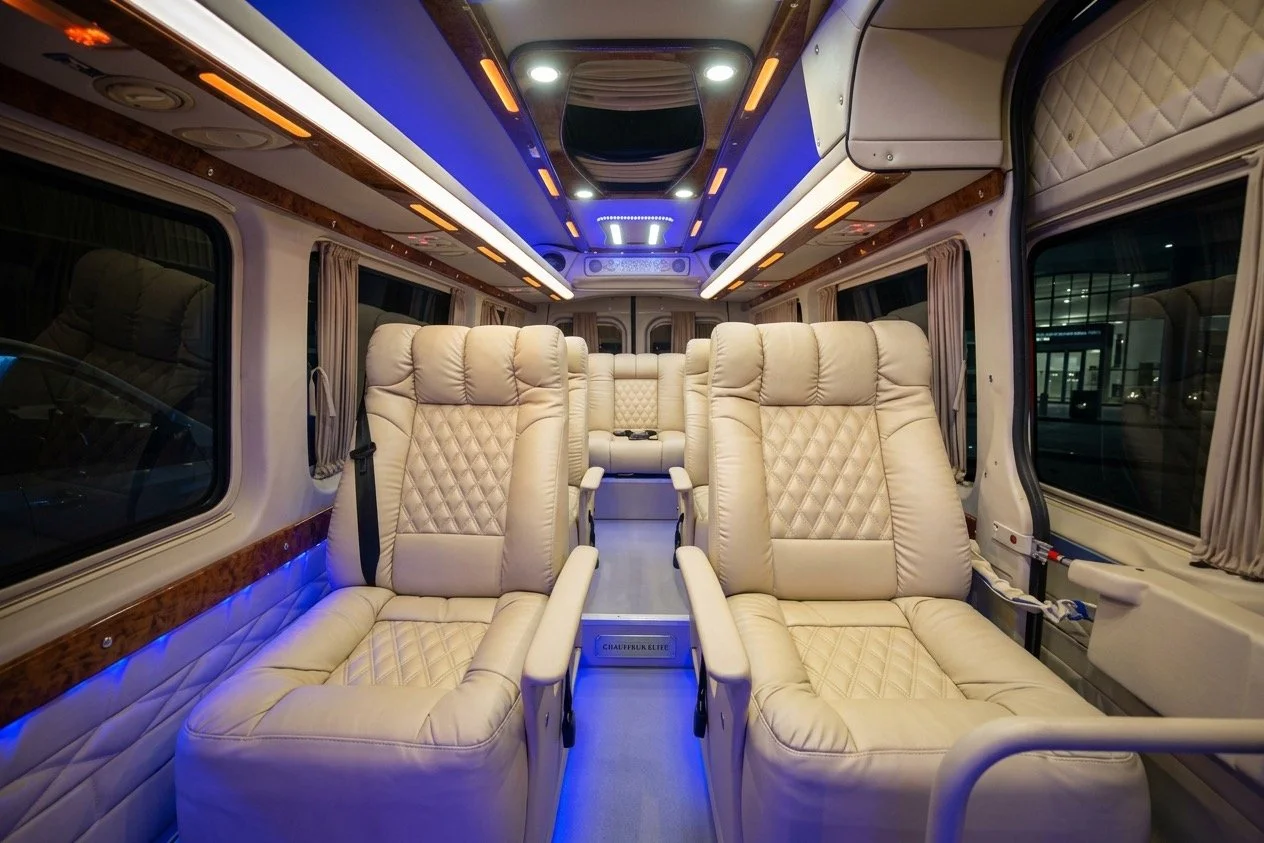 The minibus interior is crafted to deliver a refined executive travel experience from the moment the door opens. It features fully padded cream leather seating with four reclining business-class captain seats, extended legroom, individual armrests, and smooth recline functionality. A luxury rear seating configuration is paired with a premium wood-finished dashboard, soft ambient interior styling, and climate-controlled air conditioning throughout for consistent comfort.