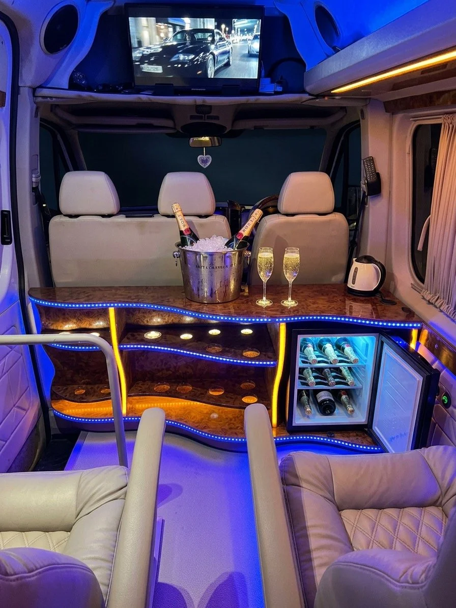 The rear cabin functions as a private lounge, complete with an integrated drinks bar, on-board fridge, and spacious social layout, alongside overhead luggage storage and a large rear boot with capacity for up to 20 cases — ideal for weddings, corporate travel, airport transfers, and private events.